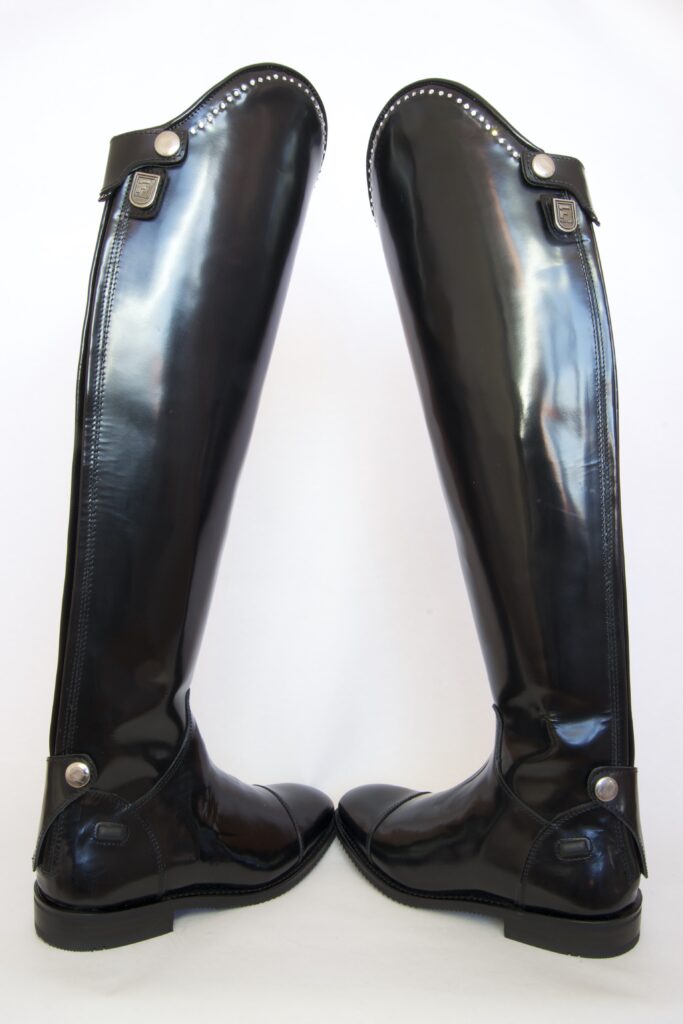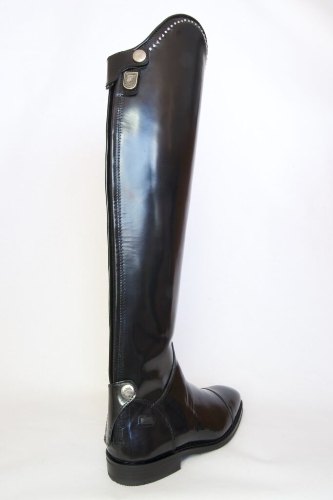 Fabricada en piel Box Calf premium con acabado liso de alto brillo, incorpora detalle superior con cristales Swarovski que realzan la silueta sin perder sobriedad. Equipada con cremallera YKK de alta resistencia y suela Vibram especial para equitación, garantiza estabilidad, seguridad y máximo rendimiento técnico. Su construcción Goodyear Welted asegura durabilidad superior y confort prolongado.
