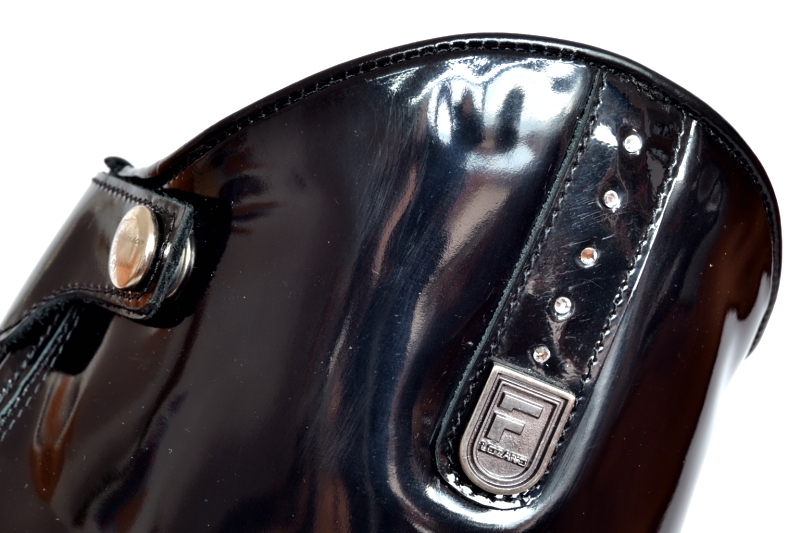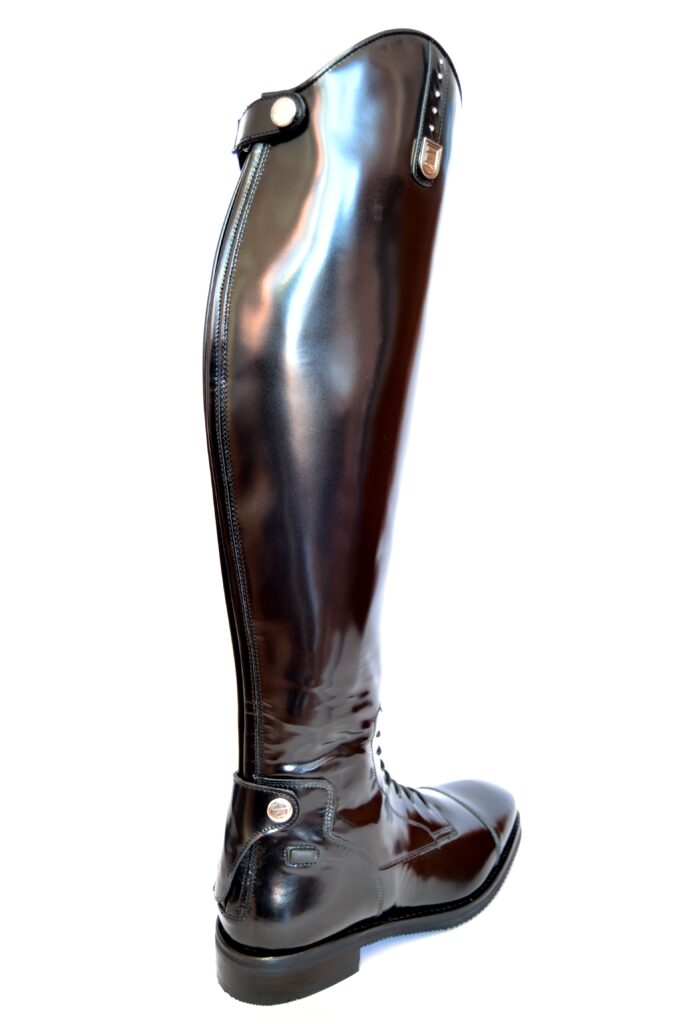 Nuestra bota de equitación Classic Cordones Negro Pulido Swarovski hecha a medida combina el diseño técnico de la bota con cordones con un elegante detalle de cristales que aporta brillo y distinción.