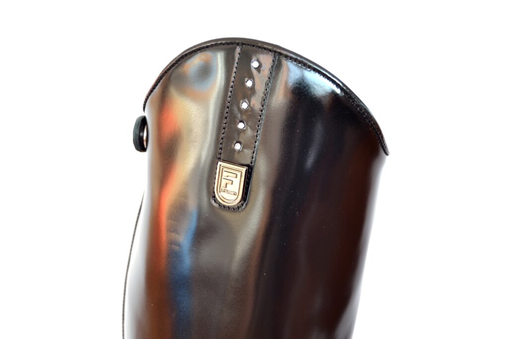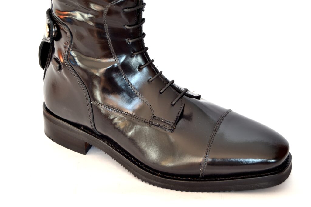 Fabricada en piel Box Calf premium, incorpora cordones frontales para un ajuste preciso, cremallera YKK, suela Vibram especial para equitación y construcción Goodyear Welted para máxima durabilidad y confort.